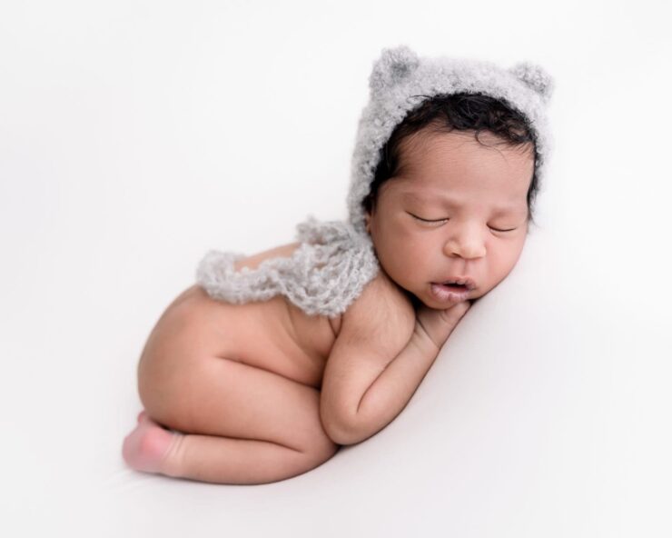 The best time for those snuggly, curly newborn poses is within the first 5–16 days, while they’re still curled up just like they were in the womb. But don’t worry if your baby is a little older, I have plenty of experience working with babies of all ages and will still create gorgeous keepsake images for you.